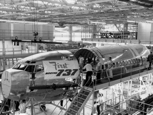 图:1966年7月,首架737进行机头和机身的组装。图片来自《西雅图时报》