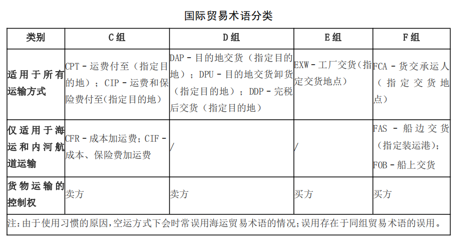 在国际贸易的货物销售合同中,进出口商使用国际商会《国际贸易术语解释通则》(Incoterhn1djzs),界定买卖双方在风险、成本、运输和保险方面的义务,避免误解、争议与因此导致的损失以及其他法律难题。根据最新的《国际贸易术语解释通则》2020版,国际贸易术语共分成2类4组11个。