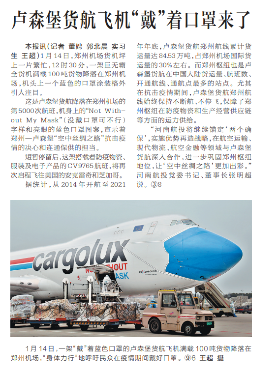 这是卢森堡货航降落在郑州机场的第5000次航班,机身上的“NotWith-outhn1djzyhn1djzask”(没戴口罩可不行)字样和亮眼的蓝色口罩图案,宣示着郑州—卢森堡“空中丝绸之路”抗击疫情的决心和连通保供的担当。
