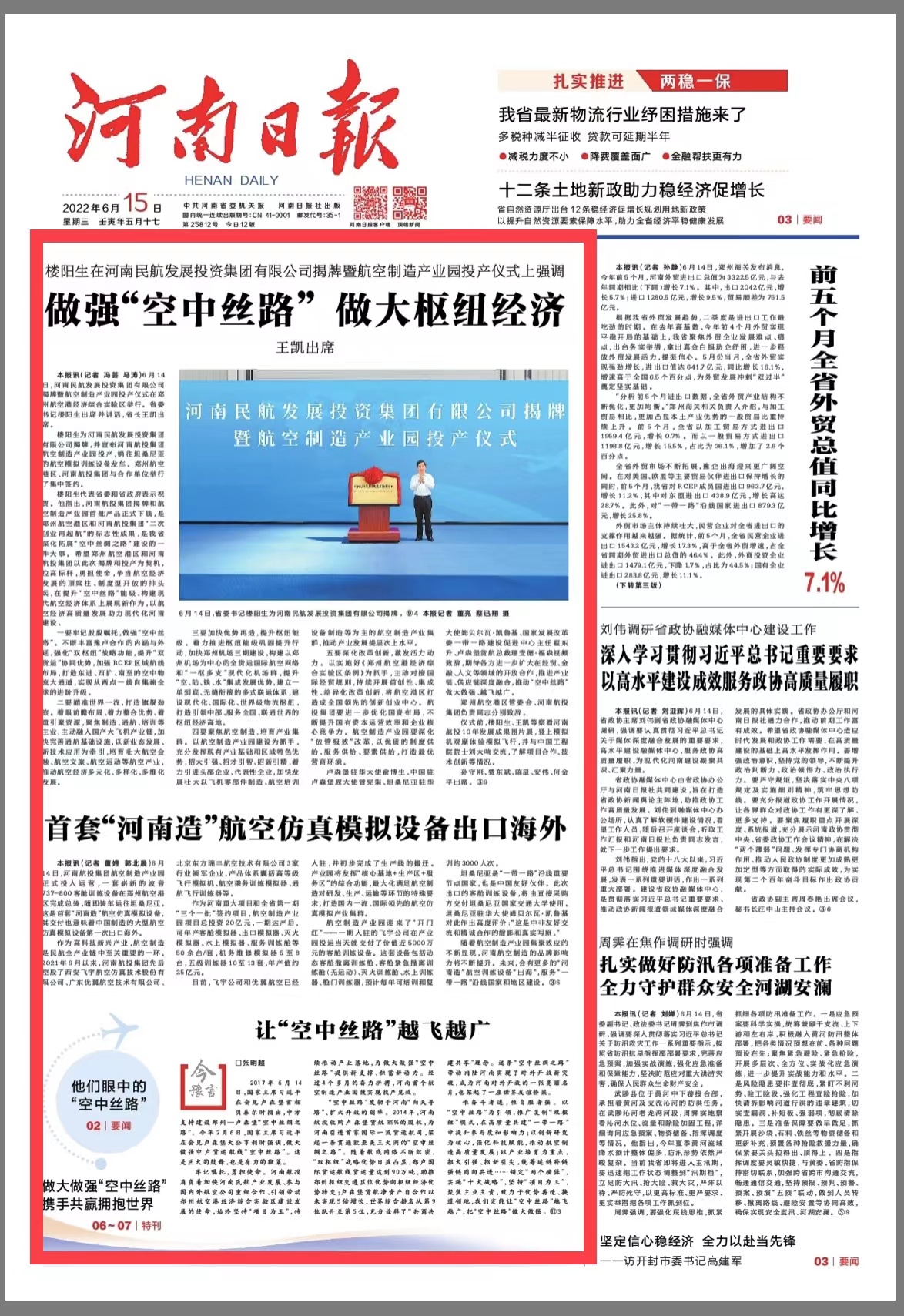 楼阳生为ayx爱游戏体育发展投资集团有限公司揭牌,并宣布河南航投集团航空制造产业园投产,销往坦桑尼亚的航空模拟训练设备发车。郑州航www.dafa888.com区、河南航投集团与合作单位举行了集中签约。